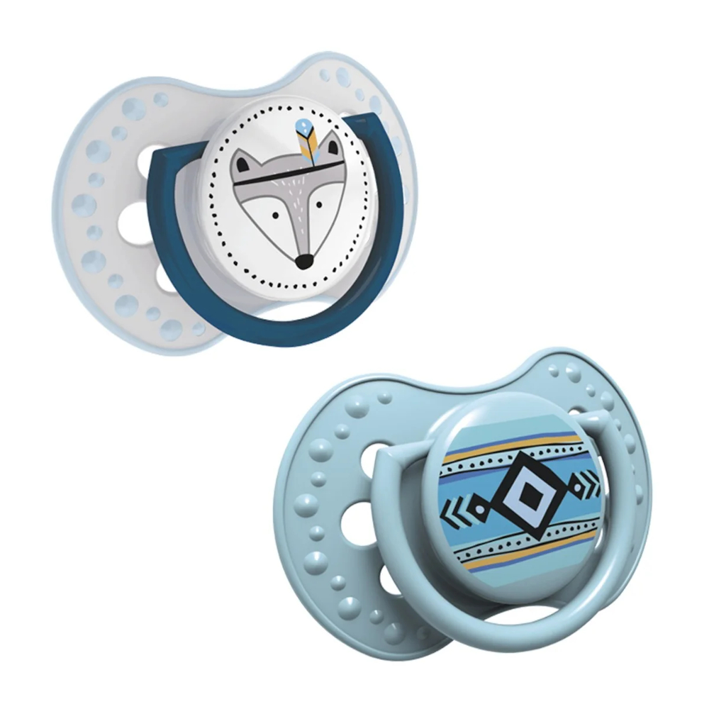 W zestawie znajdują się dwa smoczki we wzorze Indian Summer Boy, które zdobyły uznanie rodziców i zostały docenione w badaniach konsumenckich.
