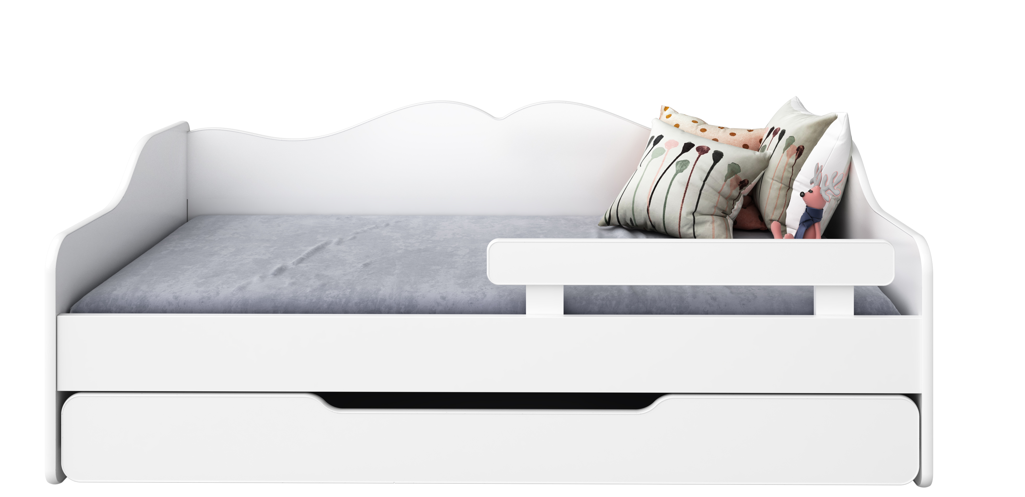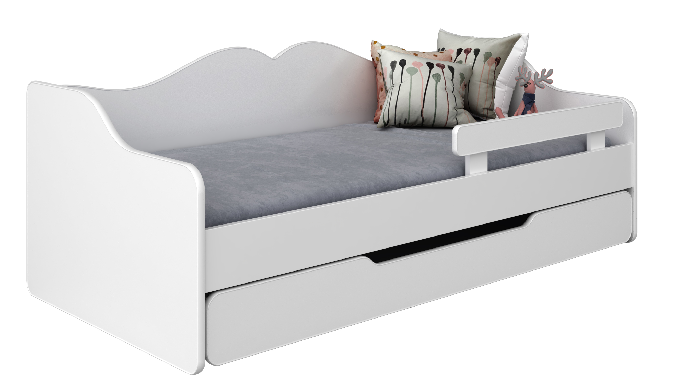 Wszystkie krawędzie łóżka są wykończone gumowym obrzeżem, co skutecznie chroni malucha przed urazami. To niezwykle ważne, gdy dziecko stawia pierwsze kroki w samodzielności lub zaprasza przyjaciół do wspólnej zabawy. Dodatkowo, łóżko BELLA2 zostało wyposażone w szufladę z materacem, która pełni funkcję dodatkowego miejsca do spania – idealna na nocowanie rodzeństwa lub przyjaciół! W każdym momencie możesz przekształcić je w wygodną sofę, dodając poduszki na oparcie. To sprawia, że łóżko jest niezwykle funkcjonalne, szczególnie w mniejszych pomieszczeniach, gdzie liczy się każdy centymetr.