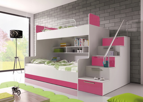 Łóżko wyposażone jest w szufladę pod dolną powierzchnią spania. Górne łóżko wyposażone jest w barierkę ochronną. Możliwość dokupienia barierki do dolnego łóżka w cenie 150 zł. Schodki łóżka mogą służyć jako praktyczne schowki.