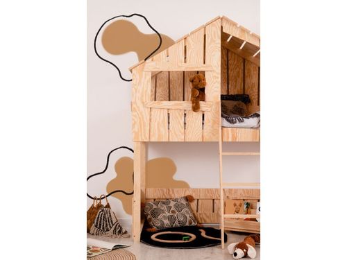 Łóżko piętrowe TED A to oryginalny pomysł na łóżko typu antresola, które wzbudzi w dziecku zachwyt i ogromną radość z możliwości spania w takim łóżku domku. Łóżko te wyróżnia się na tle innych modeli konstrukcją, która nie jest jedynie szkieletem, a posiada daszek, ścianki oraz okna. Takie łóżko domek będzie nie tylko doskonałym miejscem do spania, ale również zabawy i relaksu pełniąc funkcję oazy. Dodatkowo ozdabiając od wewnątrz łóżeczko kolorowymi lampkami stworzymy dziecku wyjątkowo przyjazny klimat pozwalający dziecku poczuć się w nocy bezpiecznie. Zaletą łóżka antresola jest możliwość dowolnej aranżacji przestrzeni znajdującej się pod łóżkiem. Możemy zrobić tam dziecku kącik zabaw lub wstawić komodę albo biurko. Łóżko dziecięce 90x190 jest produktem polskim skonstruowanym z surowej sklejki sosnowej. Dzięki zastosowaniu sklejki niepokrytej farbami i lakierami mebel jest bezpieczny dla małych użytkowników i ekologiczny. Łóżko piętrowe TED A w zestawie posiada stelaż z elastycznymi listwami, ale sprzedawane jest bez materaca. Wybierając materac do tego pojedynczego łóżko należy pamiętać, aby wysokość materaca nie przekraczała 12 cm.