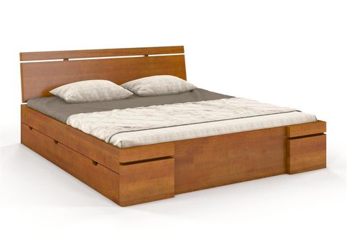 To model, który doprecyzowaliśmy w każdym szczególe, czego potwierdzeniem są dopracowane detale. Narożniki tego łóżka są subtelnie zaokrąglone, dzięki czemu staje się ono bezpieczne w użytkowaniu. Zagłówek jest dwuelementowy, a dla zwiększenia wygody został lekko pochylony. Łóżko SPARTA to łóżko wysokie - jego wysokość wynosi 86 cm. Dla większego komfortu łóżko wyposażono w aż 4 szuflady – po dwie na każdym z boków. Ich pojemność przewiduje duże potrzeby – pomieszczą wiele. Pozwalają swobodnie ukryć przed światem to, co powinno zniknąć z codziennej powierzchni użytkowej. Materiał: lite drewno sosnowe. Zagłówek: lite drewno sosnowe. Kolor drewna: do wyboru ze wzornika. Sposób wykończenia drewna: dwukrotne szlifowanie + bejca + 2 warstwy lakieru. Drewno łączone na "mikrowczepy" - dzięki temu pozbawione jest ono skaz i sęków. "Piąta" noga wzmacniająca konstrukcję łóżka.