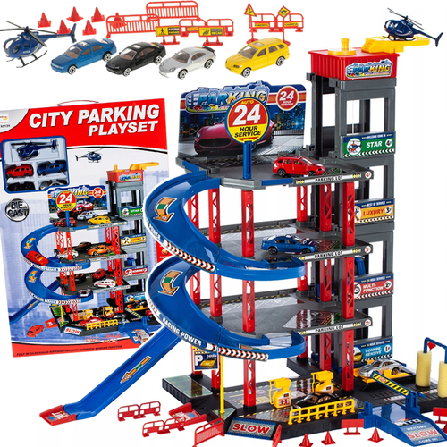 Parking posiada stacją benzynową, podnośnikiem, myjnią, warsztatem samochodowym oraz lądowiskiem dla helikoptera i windą którą przetransportuje się auta na jedno z czterech pięter. W zestawie znajdziemy również zestaw znaków drogowych.