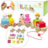 Drewniany pociąg stanowi doskonałą pomoc edukacyjną. Podczas zabawy dziecko rozwija umiejętności rozpoznawania kształtów, kolorów, zwierząt, liczenia oraz trenuje zdolności manualne i koordynację ruchową.