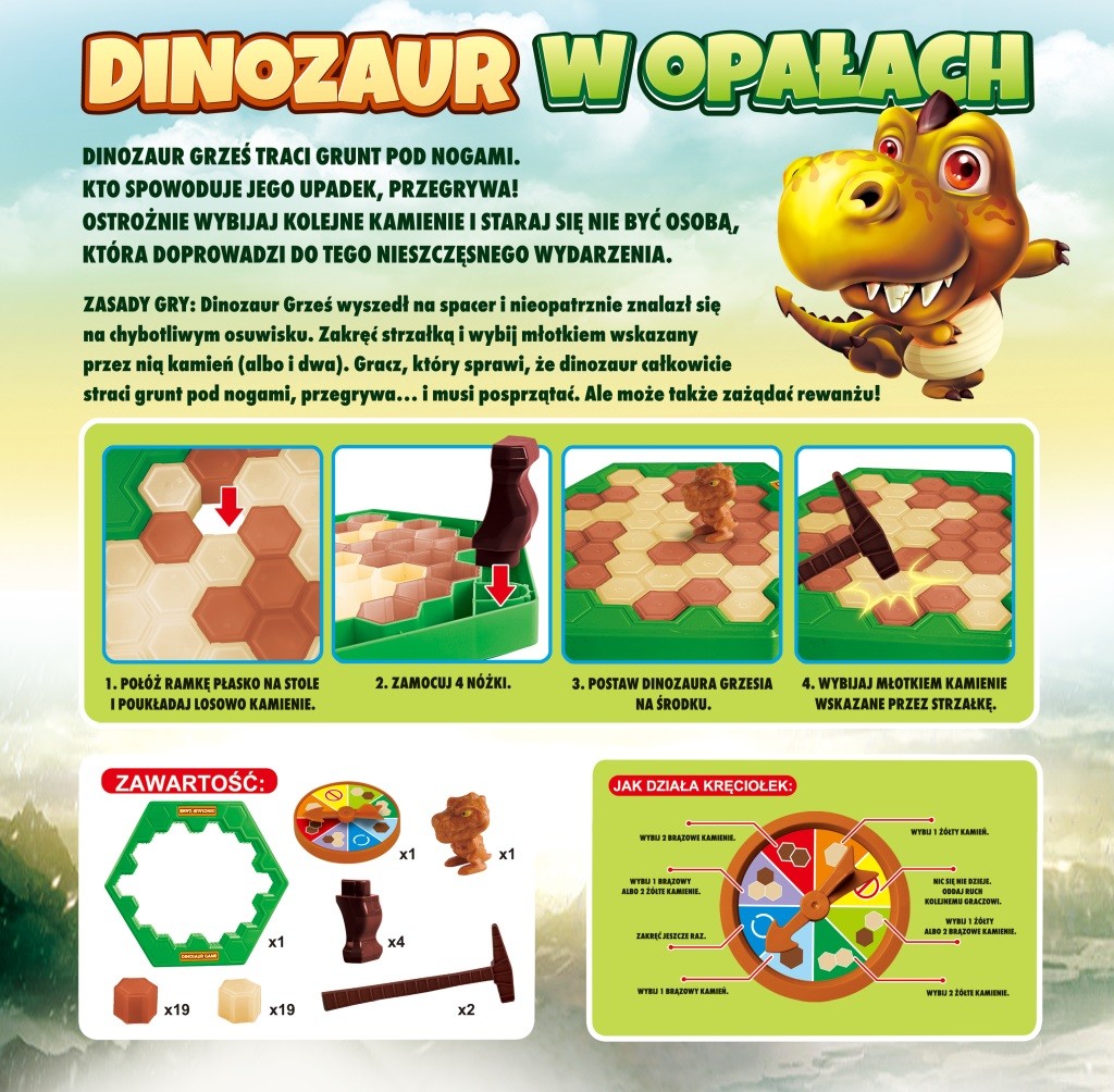 Zasady są bardzo proste: zakręć strzałką i wybij młotkiem wskazany przez nią kamień (albo i dwa). Gracz, który sprawi, że dinozaur całkowicie straci grunt pod nogami, przegrywa i musi posprzątać. Ale może także zażądać rewanżu!