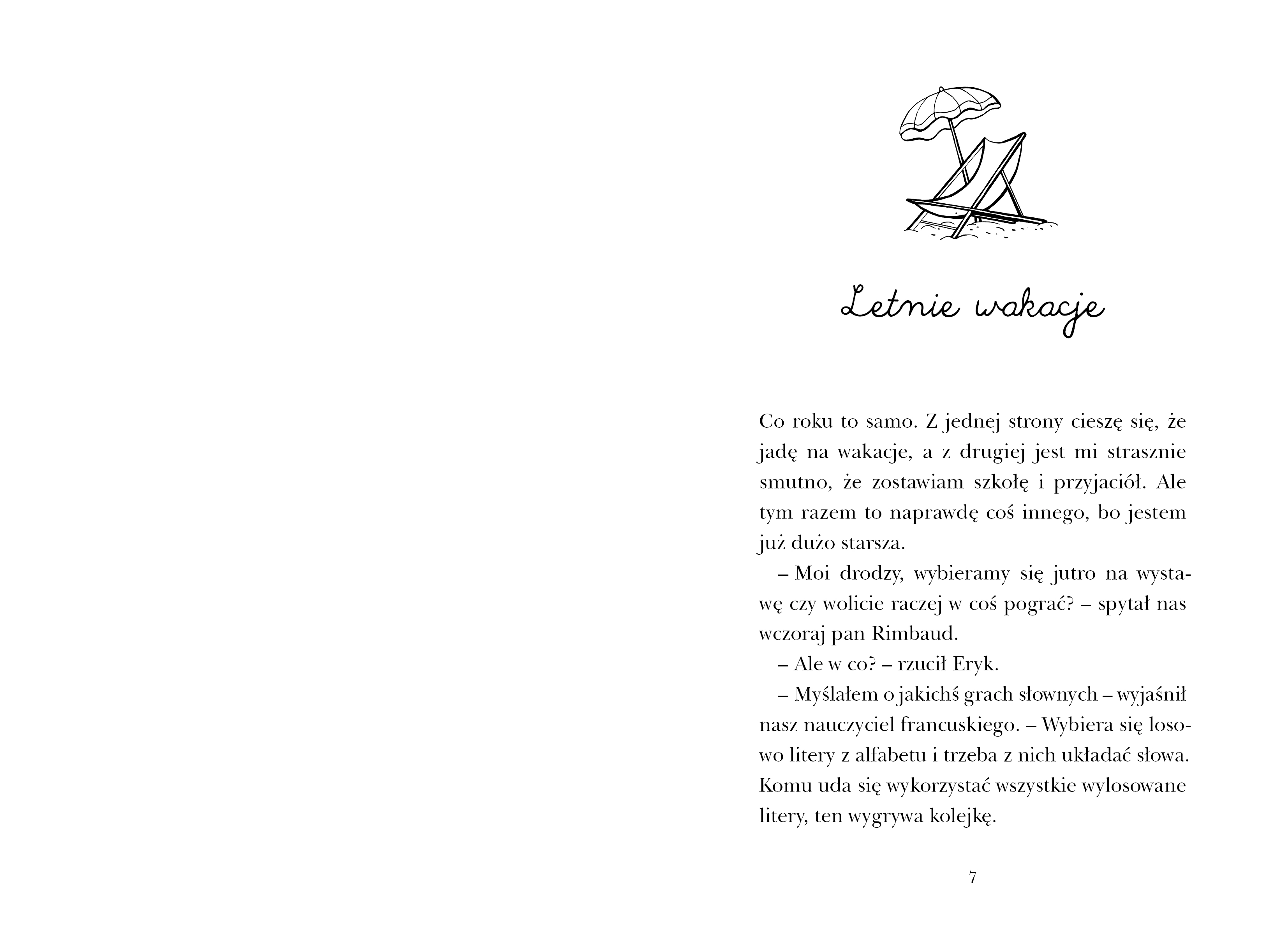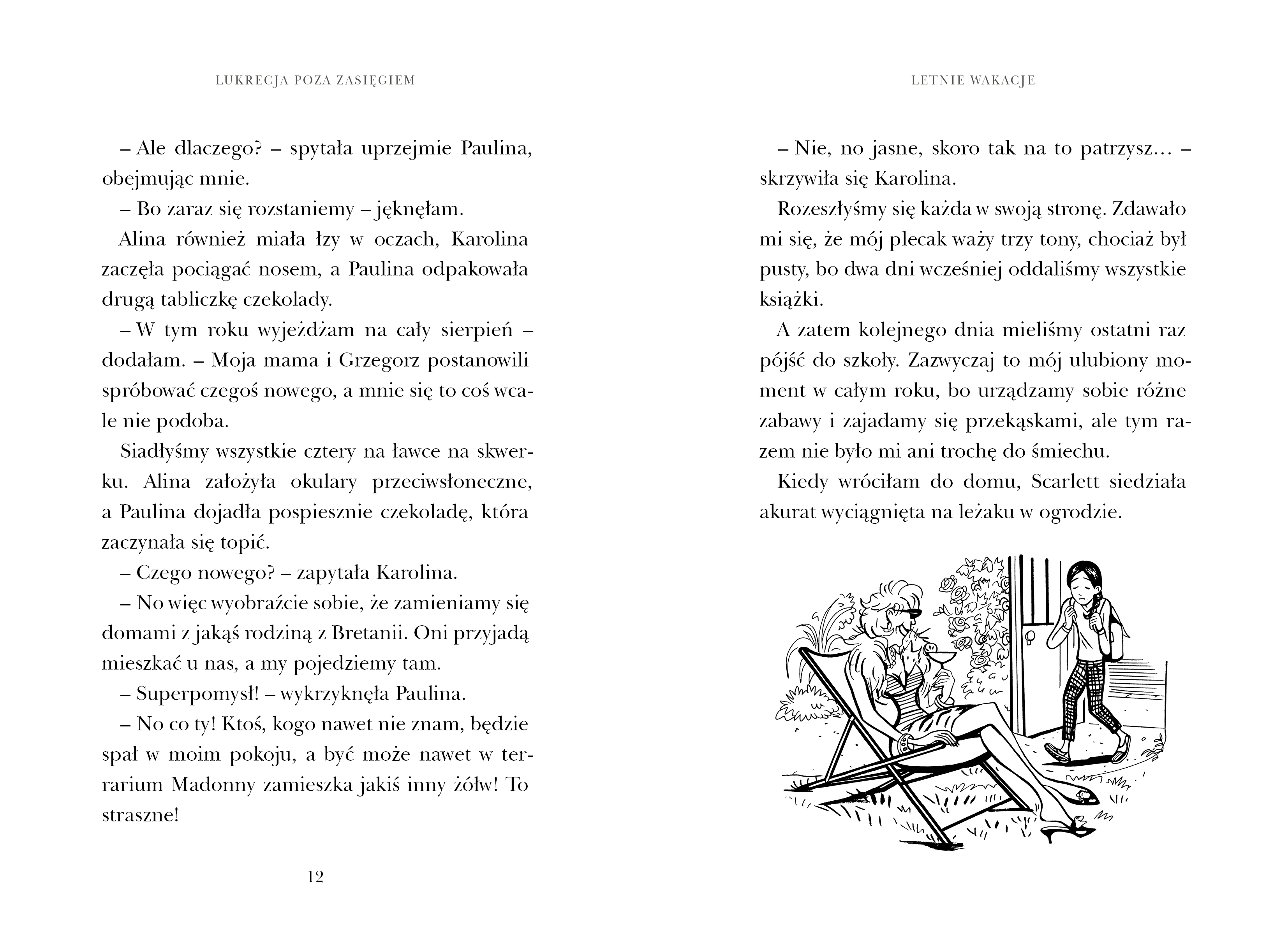 Jak przetrwać miesiąc offline? Tylko dorośli mogli coś takiego wymyślić - na miesiąc zamieniliśmy się domami z jakąś obcą rodziną! Nie dość, że musieliśmy się przenieść z Paryża na wieś, to jeszcze na miejscu okazało się, że zamieszkamy w domu z poprzedniej epoki. A co najważniejsze: nie było tam zasięgu! Nie mogłam nawet o tym napisać najlepszym przyjaciółkom. Nasze życie rodzinne wywróciło się do góry nogami: mój brat, zamiast masakrować zombiaki na konsoli, zaczął czytać komiksy, a ojczym przestał gotować. Tylko co można robić na wsi bez Internetu, skoro mama nie umie jeździć na rowerze? Anne Goscinny, córka René Goscinnego, stworzyła współczesną serię dziewczyńskich przygód, które zilustrowała Catel. Pokolenie Mikołajka dorosło, więc czas na nowe: pokolenie Lukrecji! Dotychczasowych pięć tomów zostało docenionych przez czytelników, o czym świadczą nominacje do tytułu najlepszej książki dziecięcej 2019 roku w plebiscytach Empiku i Lubimy Czytać. W świecie dorastającej Lukrecji rządzą kobiety - zwariowane, mądre, niezależne. Za sznurki pociąga mama, ale tylko w czasie wolnym od bycia adwokatką (świat sam się nie naprawi, prawda?), a domowe stery często przejmuje babcia Scarlett, która organizuje wystawne przyjęcia (z bąbelkami!). Choć i tak najwięcej do powiedzenia ma właśnie Lukrecja. Mikołajek pękałby ze śmiechu! Poprzednie tomy serii: • Lukrecja • Lukrecja stawia na swoim • Lukrecja na pierwszym planie • Lukrecja rusza w świat • Lukrecja i dziwny świat dorosłych