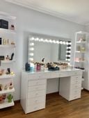 Oferujemy wyjątkowe lustro wizażowe o funkcji wiszącej lub stojącej – doskonałe rozwiązanie dla każdej miłośniczki makijażu! Dzięki jego eleganckiej ramie z białej płyty jest to nie tylko funkcjonalny element, ale również stylowa dekoracja każdego wnętrza. Lustro o wymiarach 150 cm x 100 cm x 7 cm dostarczane jest w całości, co czyni je gotowym do natychmiastowego użytku.