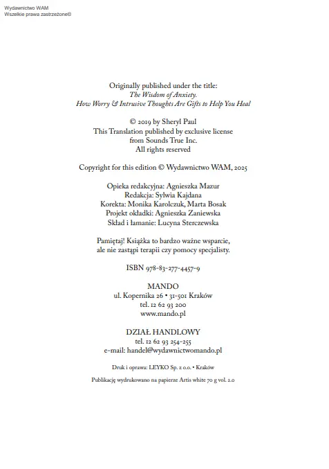 "Mądrość lęku" Sheryl Paul to książka, która uczy nas jak nie uciekać przed własnym lękiem. A przecież tam, gdzie boli, kryje się największe źródło siły i czułości wobec siebie. Autorka prowadzi nas przez ciało, emocje, umysł i duszę, pokazując, że lęk nie jest wrogiem, lecz posłańcem. To wezwanie do wzrastania, do spotkania się z sobą prawdziwym - w pełni, bez wstydu, bez ucieczki.