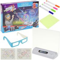 Wystarczy umieścić przezroczystą ścieralną tablicę na jednym z trzech dwustronnych szablonów i zacząć rysować. Gdy obrazek będzie gotowy, trzeba wsunąć tablicę w podświetloną podstawę, założyć okulary 3D i cieszyć się magią!