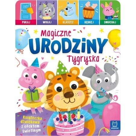 Tygrysek ma dzisiaj urodziny. Ty też jesteś zaproszony! Czym prędzej dołącz do gości. Dzięki tej interaktywnej książce dziecko może brać udział w przyjęciu: pukać do drzwi, śpiewać piosenkę urodzinową i składać Tygryskowi życzenia, klaskać i tańczyć, a także grać na bębnach i gasić świeczki na urodzinowym torcie. Ta niezwykła książeczka interaktywna z nagraniami oraz efektem świetlnym spodoba się każdemu dziecku i zachęci je do wspólnej zabawy. Jak korzystać z książki? Dziecko naciska rysunek na górnym panelu i wykonuje polecenie, które usłyszy. Na końcu dmucha na światełka i gasi świeczki na torcie. Krótki tekst doskonale nadaje się do pierwszych prób w czytaniu, młodszym dzieciom przeczyta rodzic. Zabawa tą książką to niezapomniane wrażenia! Efekty dźwiękowe oraz świetlne spodobają się każdemu dziecku. Wystarczy tylko nacisnąć wskazane miejsce lub dmuchnąć na światełka. Zaproś malucha do wyjątkowej zabawy!