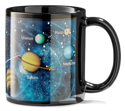 Co sprawia, że nasz Magiczny Kubek jest tak wyjątkowy? Po zalaniu go gorącym napojem, zmienia się z niepozornego, czarnego kubka w przepiękny, kolorowy obraz układu słonecznego. Pozwól sobie na chwilę magii i odkryj nieskończoność galaktyki przy każdej filiżance herbaty czy kawy!