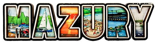 Magnes epoksydowy, trójwymiarowy - Mazury. Magnes przedstawiający widok z pięknej krainy jaką są Mazury. Magnes składa się z 6 rysunków z krainy Wielkich Jezior Mazurskich wpisanych w słowo MAZURY.