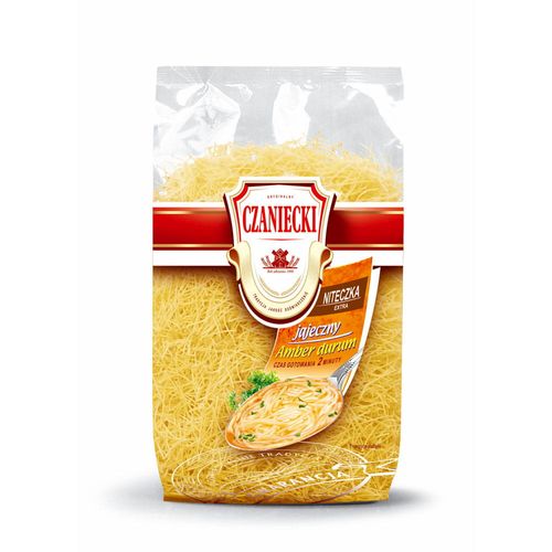 Makaron Czaniecki Amber Durum Niteczka Extra 250g to wybór, który łączy w sobie jakość, tradycję i nowoczesność. Stworzony z najwyższej jakości semoliny z pszenicy durum oraz świeżych jaj, ten makaron jajeczny zapewni Twoim potrawom wyjątkowy smak oraz wartości odżywcze. Każdy kęs to prawdziwa uczta dla podniebienia!