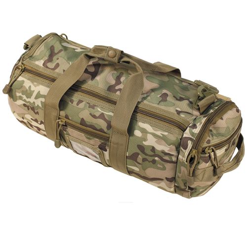 Mała okrągła torba na ramię "Molle" operation-camo wykonana jest z wytrzymałego materiału 100% poliester, co zapewnia jej długowieczność oraz odporność na różne warunki atmosferyczne. Z wagą zaledwie 600 g i kompaktowymi wymiarami (45 cm długości, 19 cm średnicy) jest to torba, którą możesz zabrać wszędzie, nie obciążając się zbytnio.