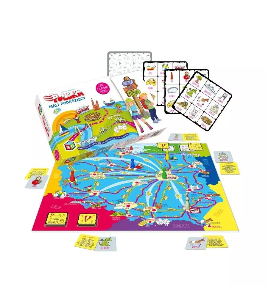 Z tej gry dowiesz się, gdzie leżą różne polskie miasta. Poznasz ich wizytówki i atrakcje turystyczne. Na kartach w grze znajdziesz fakty i ciekawostki dotyczące poszczególnych atrakcji oraz miast, w których się one znajdują. Podróżuj samochodem, pociągiem, samolotem. Zdobądź jak najszybciej wszystkie atrybuty ze swojej karty gracza, a zostaniesz zwycięzcą. W zestawie: – plansza, – pionki (6 sztuk), – żetony „start” (6 sztuk), – karty „graczy (6 sztuk), – karty „atrakcji”(54 sztuki), – karty „pojazdów” (42 sztuki), karty losu „lot balonem” (8 sztuk), – instrukcja. Rozmiar opakowania: 38.0 x 26.0 x 5.5 cm