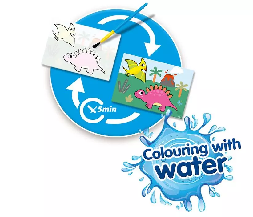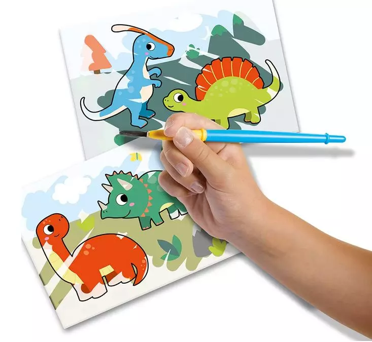 Z tym zestawem do malowania od SES Creative dzieci stworzą małe dzieła sztuki bez brudzenia, bo tutaj maluje się samą wodą! Po prostu pomaluj kartę mokrym pędzlem i zobacz co się stanie. Odkrywaj dinozaury kawałek po kawałku - od małego dinozaura, przez mamę dinozaura, po duże latające dinozaury. Gdy grafika wyschnie, kolor znika całkowicie, a kartka jest ponownie biała z wyjątkiem konturów. Karty do malowania można używać wielokrotnie, zapewniając w ten sposób niekończącą się kreatywną zabawę.