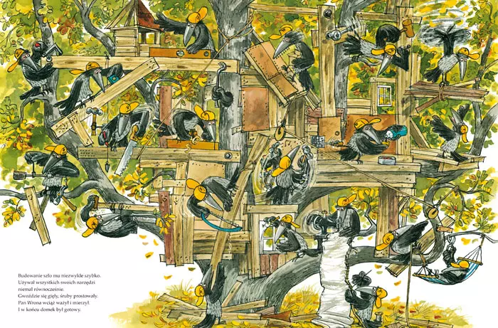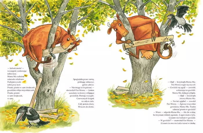 Czy krowy potrafią budować? I to w dodatku domki na drzewie? Mama Mu jak zwykle dowiedzie, że niemożliwe jest możliwe, szczególnie jeśli wyznaje się zasadę: „To nic, że gwóźdź jest krzywo wbity. Domek i tak jest znakomity!” Pan Wrona nie byłby sobą, gdyby z wyższością nie skrytykował budowli Mamy Mu i nie zaczął popisywać się własnymi budowniczymi umiejętnościami. Jak wyglądać będzie jego architektoniczne cudo? Smakowite językowo dialogi, szybkie zwroty akcji, niebanalny humor i świetna konstrukcja postaci – tak piszą Jujja i Tomas Wieslanderowie. Przy ich książkach dobrze bawią się nie tylko dzieci. Bogate w szczegóły, genialne ilustracje Svena Nordqvista, znanego również z książek o Pettsonie i Findusie, pełne są niespodzianek dla spostrzegawczych i wspaniale oddają charaktery obu bohaterów. „– Ale skąd krowa wytrzaśnie deski? – zawołał Pan Wrona. – Dzieci zostawiły trochę desek – odparła Mama Mu. – A co to takiego!? – Młotek, Panie Wrono. Młotek jest potrzebny, gdy człowieka najdzie ochota na… – Ale ty jesteś krową! Krowy nie potrzebują młotków. – Owszem, potrzebują, kiedy je najdzie ochota na budowanie…”