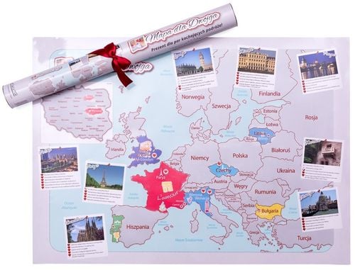 Mapa Zdrapka dla Dwojga to nie tylko atrakcyjny element dekoracyjny, ale przede wszystkim wspaniała okazja do wspólnego spędzania czasu i wspominania przebytej drogi. Mapa fortun i uczuć o rozmiarze 864x606mm zachęca zakochanych do odkrywania europejskich skarbów, które oboje pragniecie odwiedzić. Wraz z ukochaną osobą możecie zaznaczyć wszystkie miejsca, które już zwiedziliście, a następnie zdrapać je z mapy, co będzie nie tylko frajdą, ale również doskonałą pamiątką.