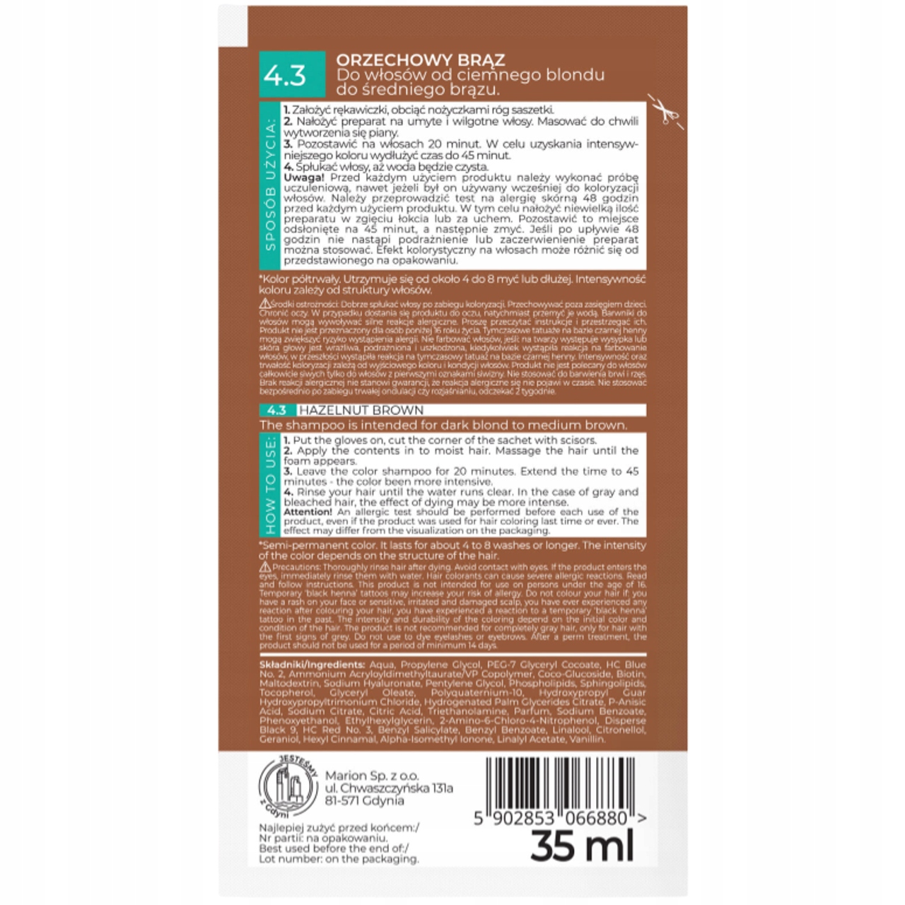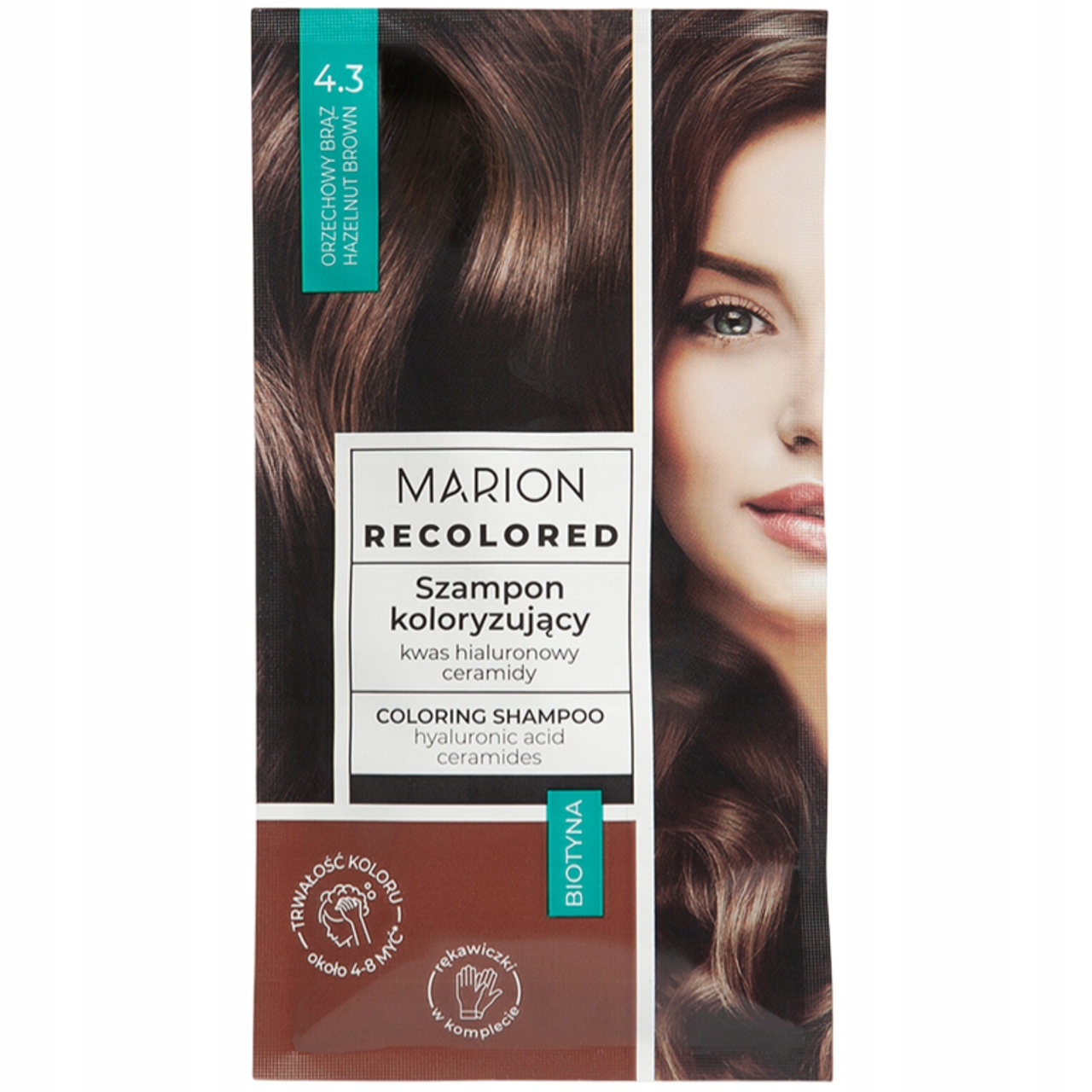 ✨ Szampon koloryzujący MARION Recolored 4.3 ORZECHOWY BRĄZ nadaje się do włosów od ciemnego blondu do średniego brązu.