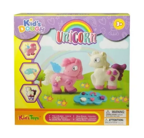Zestaw kolorowej masy plastycznej (3szt) oraz foremek jednorożców oraz innych akcesoriów potrzebnych do stworzenia jednorożców jak skrzydełka, nożyczki, nożyk, oczy. Produkt zapakowany w kartonowe opakowanie. Produkt dla dzieci od 3 lat. Podane wymiary są wymiarami opakowania.