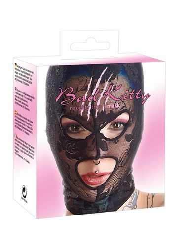 Czarna, szczelnie przylegająca maska na głowę z otworami na usta i oczy