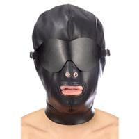 Maska/kominiarka na całą głowę z otworem na oczy i usta, która pozwala ukryć tożsamość użytkownika. Wykonana z wysokiej jakości skóropodobnego materiału który idealnie dopasowuje się do każdego rozmiaru głowy. Dwa otwory w miejscu nosa pozwalają na swobodę oddychania. Kominiarka posiada sznurowanie z tyłu głowy oraz pasek ze sprzączką, dzięki, któremu indywidualnie dopasujesz maskę do obwodu szyi. Dodatkowo zestaw posiada specjalną osłonę na oczy.