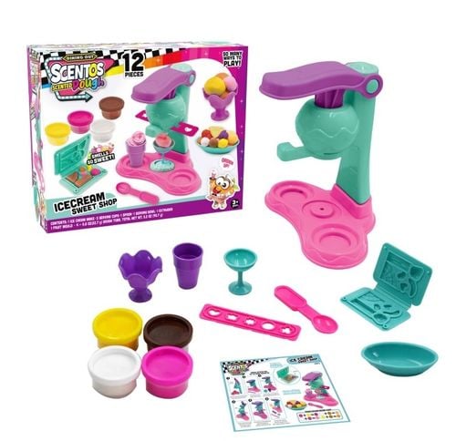 – w zestawie 12 elementów: zabawkowa maszynka do tworzenia ciastolinowych lodów, 3 zabawkowe naczynia do serwowania, 1 zabawkowa łyżka, 1 zabawkowa miseczka, zabawkowa wytłaczarka, foremka z kształtami owoców i 4 kubeczki z pachnącą ciastoliną (w różnych kolorach);