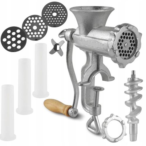 Zestaw zawiera aż 3 sita o różnych rozmiarach oczek (3mm, 5mm, 8mm) oraz 3 lejki do nadziewania kiełbas o różnych średnicach (13mm, 17mm, 19mm). Ta różnorodność akcesoriów pozwala na przygotowywanie szerokiej gamy potraw mięsnych, od drobno zmielonych farszów po grube kiełbasy.