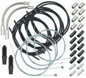 Zestaw zawiera wszystkie niezbędne elementy, takie jak aluminiowe końcówki linek, plastikowe i mosiężne końcówki pancerzy, prowadnice linek hamulca V-brake oraz gumowe osłony, zapewniając kompletne i profesjonalne rozwiązanie.