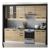 Ten wysokiej jakości zestaw mebli kuchennych Jola o długości 2,4 m w kolorze dąb sonoma wyróżnia się nie tylko eleganckim i praktycznym designem, ale także wyjątkową trwałością materiałów. Korpus z płyty laminowanej o grubości 16 mm w kolorze białym o zwiększonej odporności na zadrapania zapewnia stabilność i niezawodność na co dzień, idealnie integrując się z Twoim wnętrzem.