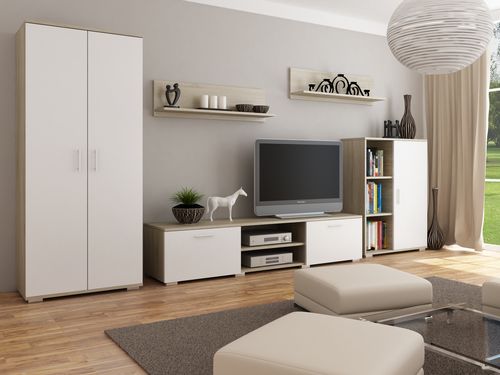 Przedmiotem aukcji jest meblościanka "California" z płyty laminowanej w kolorze dąb sonoma z białymi frontami