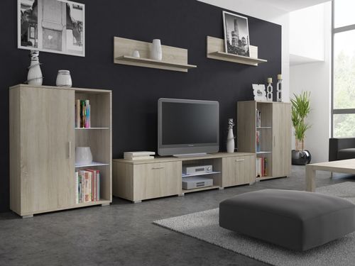 Meblościanka Herkules Dąb Sonama LED to idealne rozwiązanie dla Twojego salonu, które łączy nowoczesność z elegancją. Ta pięknie zaprojektowana meblościanka, wykonana z wysokiej jakości płyty laminowanej, jest dostępna w modnym kolorze dąb sonoma, który wprowadzi do Twojego wnętrza ciepło i przytulność. W zestawie znajdziesz wszystko, co potrzebne do zorganizowania przestrzeni, w tym szafki RTV, półki wiszące oraz szafki stojące.