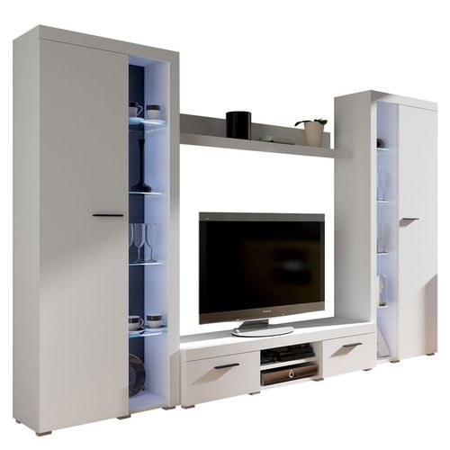 Meblościanka Rumba XL jest idealnym sposobem na praktyczne urządzenie salonu, zarówno w dużych, jak i małych pomieszczeniach. Dzięki systemowi dzielonych półek zyskujesz praktyczną przestrzeń do przechowywania. Część zamykana to pojemne półki, natomiast część ekspozycyjna zdobią szklane półki na dekoracje. Dodatkowo szafka RTV może zostać wykonana z oświetleniem LED. Szafka RTV to idealne miejsce na dekoder czy konsolę do gier, posiada również uchylne drzwiczki na akcesoria. Nad szafką znajduje się praktyczna półka o dopasowanej szerokości.
