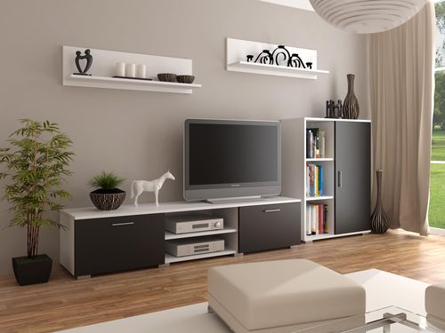 Przedmiotem aukcji jest meblościanka "Szopen" z płyty laminowanej w kolorze biało - czarnym
