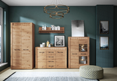 Nowoczesna meblościanka inspirowana naturą. Naturalny rysunek drewna, piękne usłojenie, wyraźne sęki podkreślają charakter meblościanki. W połączeniu z wyważoną oraz prostą stylistyką tworzą niebanalny duet, który odmieni każde wnętrze. Czarny, metalowy uchwyt świetnie kontrastuje z ciepłym dekorem dębu, a podświetlana, dekoracyjna ryfla doda Twojemu wnętrzu blasku i niepowtarzalnego klimatu.
