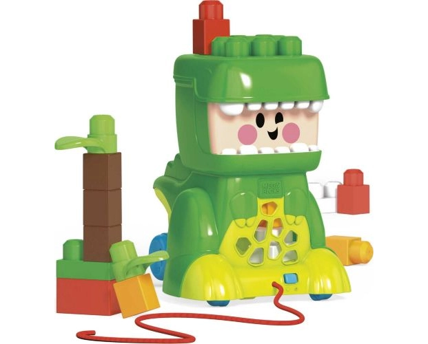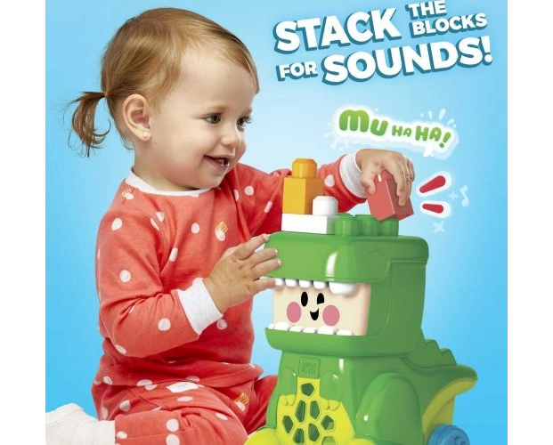 Ty i Twój maluch możecie odkryć 8 uroczych dźwięków podczas zabawy z T-Rexem i 15 dużymi klockami. Zacznij od włączenia T-Rex za pomocą włącznika / wyłącznika. Następnie twój maluch może zabrać się do budowania, układając klocki bezpośrednio na głowie T-Rexa, aby usłyszeć urocze dźwięki, lub popchnąć go, aby usłyszeć bardziej urocze dźwięki podczas toczenia. Dodatkowy ósmy dźwięk będzie odtwarzany, gdy T-Rex pozostanie bezczynny. Po zakończeniu gry bloki można przechowywać w T-Rexie w celu łatwego czyszczenia. Idealny dla pierwszych budowniczych w wieku 1+