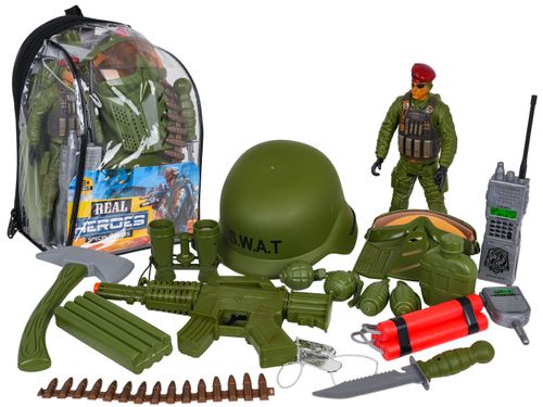 | - przezroczysty plecak, - hełm, - okulary z maską, - nóż, - krótkofalówka, - gwizdek, - manierka na wodę, - telefon, - siekierka, - lornetka, - karabin z odgłosem wystrzału, - pas z pociskami, - 4 granaty - figurka żołnierza z ruchomymi rękami i nogami, - materiał wybuchowy, - nieśmiertelnik. |