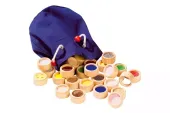 Świetna zabawka na długie, zimowe wieczory! Cała sztuka polega na tym, by bez podglądania, a jedynie przy pomocy dotyku, spośród 32 drewnianych krążków znaleźć i dopasować do siebie te o identycznej powierzchni. Wnętrze krążków wykonano z materiałów o różnej fakturze. Gracz wkłada więc rękę do worka i wyławia 1 krążek. Kiedy już to zrobi, wkłada rękę po raz drugi i spośród tych, które w worku pozostały (bez patrzenia, posługując się jedynie zmysłem dotyku) wybiera drugi do pary o dokładnie takiej samej strukturze materiału). Wygrywa ta osoba, która zbierze najwięcej par. Układanka idealnie nadaje się do rozwijania pamięci i doskonalenia zmysłu dotyku u dzieci. Krążki można przechowywać w dołączonym do zestawu poręcznym, bawełnianym worku. Zestaw zawiera 32 krążki i niebieski worek ze sznureczkiem. Średnica krążka: 4.0 cm, wysokość: 2.0 cm