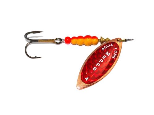 Na paletkę Aglia Long naklejony jest czerwony, łuskowany hologram. Tym razem efekt błystki ekscentrycznej - niczego istniejącego nie naśladuje, a jednak prowokuje, niekiedy bardziej aniżeli jakiekolwiek naturalne wzory. Są takie dni, kiedy czerwony, skrzący się tęczowo hologram wabi niemal wszystkie drapieżniki - od wzdręgi i okonia z jeziorowej płycizny, klenia i jazia sprzed rzecznej ostrogi, poprzez trolingowego szczupaka z głębokiej toni, po głowacicę z Popradu czy Dunajca. Redbo Giant Killer nr 5 sprawdza się też w przybrzeżnej strefie Bałtyku, gdzie bywa skuteczny na trocie i łososie.