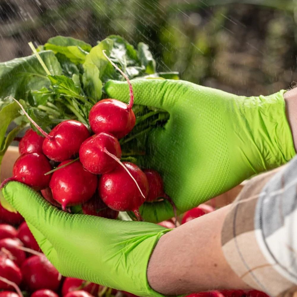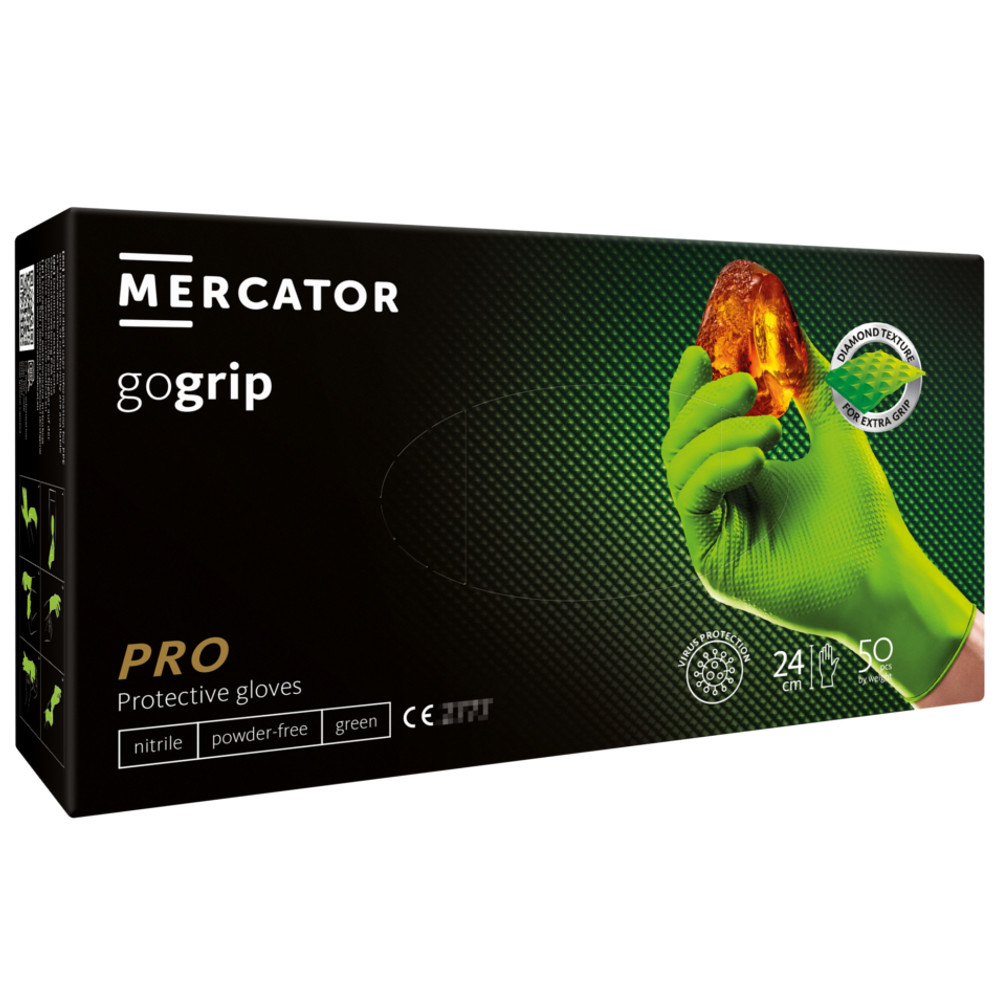 Rękawice MERCATOR gogrip green są 3 razy grubsze od standardowych cienkich rękawiczek nitrylowych*. Wykonane z elastycznego i trwałego nitrylu, cechują się unikalną diamentową teksturą 3D, która sprawia, że Twój chwyt jest mocny i stabilny nawet podczas pracy z produktami mokrymi i tłustymi. Wnętrze rękawicy zostało zaprojektowane tak, aby ograniczyć pocenie się dłoni i poprawić komfort pracy**. Idealnie dopasowany mankiet rękawicy gwarantuje komfort pracy a doskonale widoczny, intensywny zielony kolor wyróżnia się w każdym środowisku. Pracuj jak profesjonalista - w rękawicach MERCATOR gogrip możesz swobodnie obsługiwać urządzenia wyposażone w panele dotykowe. Rękawice MERCATOR gogrip green polecane są przede wszystkim w ogrodnictwie, rolnictwie, pielęgnacji roślin czy sadownictwie. Wszędzie tam, gdzie rękawice powinny stanowić ochronę przed środkami chemicznymi.