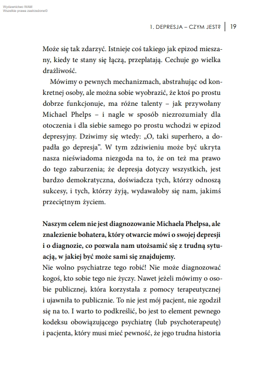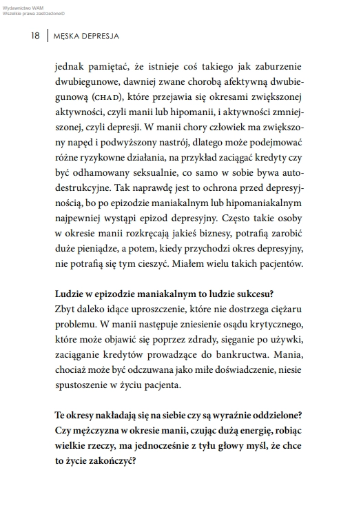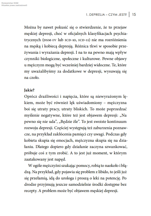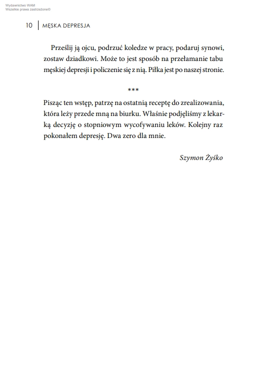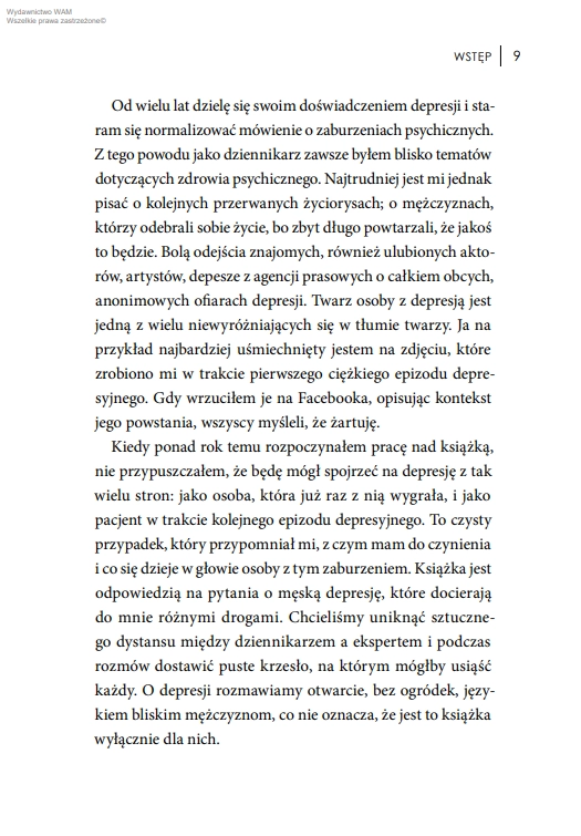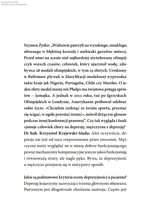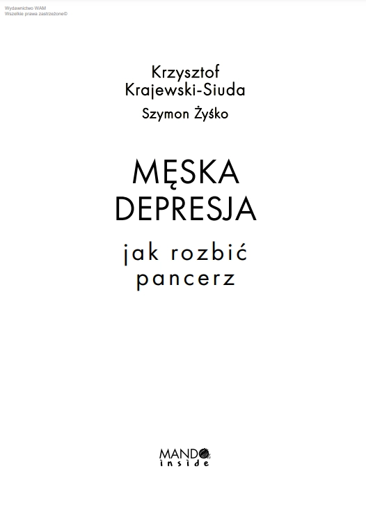 Mężczyźni też chorują na depresję, ale udają, że jest O.K. „Jestem silny. Jestem twardy. Będę walczył” – powtarzają sobie mężczyźni, gdy poczują się gorzej. Wkładają pancerz, który zamiast ich chronić, stanowi obciążenie, bo nie pozwala ujawnić słabości i zmierzyć się z nimi. Tymczasem depresja podtruwa, pustoszy, a nawet zabija. Bo to groźne zaburzenie, a nie „słabszy okres” czy „zły humor”. Jak rozpoznać depresję u siebie lub bliskiej osoby? Jak skutecznie szukać pomocy? Czy psychoterapia zmienia osobowość? Czy leki od psychiatry są bezpieczne? O być może najpoważniejszej chorobie naszych czasów – jak mówi się powszechnie o depresji – otwarcie i bez klisz rozmawiają Szymon Żyśko, dziennikarz, który sam się z nią zmagał, oraz prof. Krzysztof Krajewski-Siuda, ceniony psychiatra i psychoterapeuta. Wspólnie odkrywają mechanizmy depresji u mężczyzn i tajniki pracy nad jej zwalczeniem. Pokazują też, jak rozbić krępujący pancerz, a w zamian uzbroić się w odpowiednie narzędzia. „Jeśli jakakolwiek rozmowa dwóch osób może uratować życie, ułatwić powrót do zdrowia albo pomóc zrozumieć, to będzie to albo ta książka, albo nasza własna rozmowa z terapeutą. Innej opcji nie ma”. – Janek Świtała, ratownik medyczny