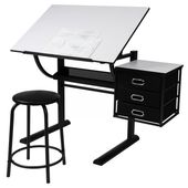 To biurko biurowe z solidną stalową ramą i odchylanym blatem zapewnia solidną podstawę do rysowania i pisania. Z boku jest szafka z trzema szufladami. Pod blatem znajduje się kolejny schowek. W cenę wliczone jest również krzesło.