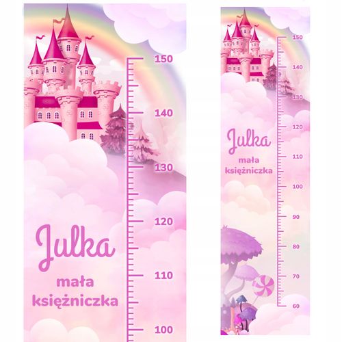 Miarka wzrostu skaluje od 60 cm do 160 cm, dostosowana do zawieszenia na ścianie, co czyni ją idealnym rozwiązaniem na długie lata. W zestawie znajdują się także plastikowe listwy mocujące, uchwyty oraz ozdobny sznurek.