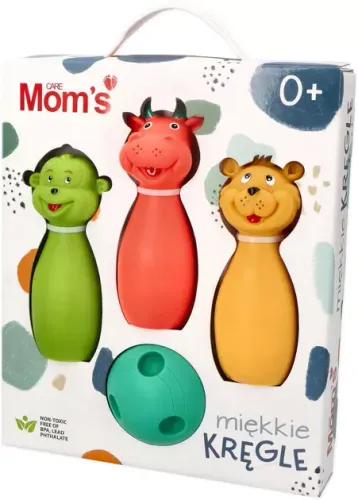 Zestaw miękkich kręgli polskiej marki Mom's Care to doskonała, rozwojowa zabawka, rekomendowana dla dzieci powyżej 10 miesiąca życia. Składa się z 3 kręgli zwierzątek (Krówka, Małpka, Miś) oraz sensorycznej kuli. Wyjątkowość tej zabawki podkreślają ciekawe, pastelowe kolory dopełnione ręcznym malowaniem.