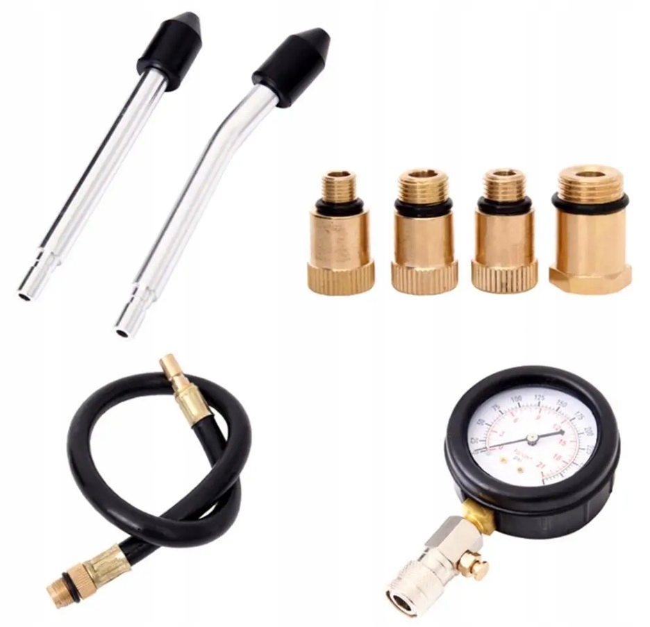 Zestaw posiada 4 adaptery oraz dwie rury z gumowymi końcówkami do pomiarów z dociskiem ręcznym, dzięki czemu jest uniwersalny i pasuje do większości samochodów.