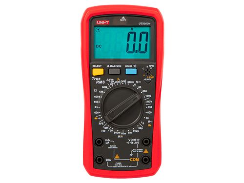 Cyfrowy multimetr UT890D+ z 6000-liczbową prawdziwą wartością skuteczną (true RMS) są zaprojektowane z dużym wyświetlaczem LCD. Maksymalna mierzalna pojemność wynosi 100 mF, a szybki czas reakcji wynosi mniej niż 12 s. Pomiar NCV i ciągłości ma wskazania akustyczno-optyczne. UT890D+ ma funkcję LIVE do rozróżniania przewodów pod napięciem i neutralnych. Ponadto jest wyposażony w automatyczne wykrywanie przepalenia bezpiecznika i zabezpieczenie przed wysokim napięciem. Specyfikacja: Napięcie stałe DC: 600mV / 6V / 60V / 600V / 1000V ±(0.5%+2) Napięcie stałe AC: 6V / 60V / 600V / 750V ±(0.8%+3) Częstotliwość ACV: 10Hz~10kHz ±(0.1%+5) Natężenie prądu stałego DC: 60uA / 600uA / 6mA / 60mA / 600mA / 20A ±(0.8%+8) Natężenie prądu stałego DC: 60uA / 600uA / 6mA / 60mA / 600mA / 20A ±(1%+12) Rezystancja: 600Ω / 6kΩ / 60kΩ / 600kΩ / 6MΩ / 60MΩ ±(0.8%+3) Kondensator: 6.000nF / 60.00nF / 600.0nF / 6.000μF / 60.00μF / 600.0μF / 6.000mF / 60.00mF / 100.0mF ±(3%+10) Częstotliwość: 9.999Hz~9.999MHz ±(1.0%+5) Maksymalny odczyt: 6000 NCV: Tak Test hFE: Tak Test diody: Tak Test ciągłości: Tak True RMS: Tak Alarm przepalającego się bezpiecznika: Tak Wskazanie akustyczno-optyczne (NCV/ciągłość): Tak Fałszywe wykrywanie wysokiego napięcia: 1000 Vrms Pamięć trybu prądu (AC/DC): Tak Alarm przetężeniowy: Tak, ≥20A Wskaźnik niskiego poziomu naładowania baterii: Tak Wstrzymanie danych: Tak Automatyczne wyłączanie zasilania: Tak, 15 minut Podświetlenie tylne: 30sek Temperatura pracy: 0℃~40℃ Bezpieczeństwo: KAT II 1000 V/KAT III 600 V Zasilanie: 2x AAA (baterie w zestawie) Waga: 346g Wymiary produktu: 183 x 88 x 56mm
