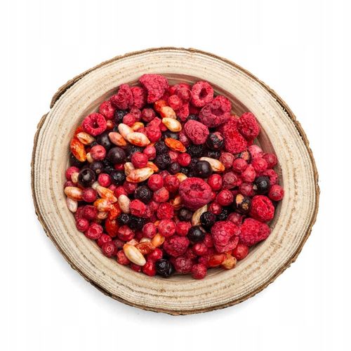 Ta wyjątkowa mieszanka owoców liofilizowanych pochodzi od lokalnego, polskiego producenta, który kontroluje cały proces - od uprawy po liofilizację. Zawiera bogate spektrum witamin A, B1, B2, B3, B6, B9, E oraz C, które zostają zachowane w niezmiennym stężeniu dzięki zaawansowanemu procesowi konserwacji bez użycia sztucznych substancji.