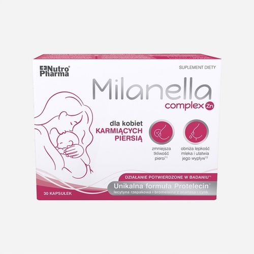 Milanella complex Zn to wysokiej jakości suplement diety stworzony specjalnie z myślą o kobietach karmiących piersią. Produkt zawiera starannie wyselekcjonowane składniki, które pomagają utrzymać prawidłowy przepływ mleka i ograniczyć dyskomfort związany z karmieniem.