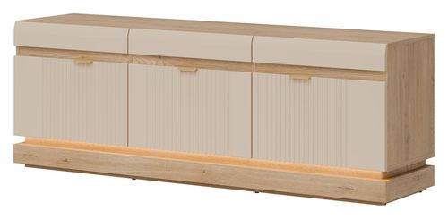 Szafka RTV ML01 z kolekcji MILTON to wyjątkowe połączenie nowoczesnego designu i ponadczasowej elegancji. Fronty MDF w modnym, matowym wykończeniu dostępne są w kilku stylowych wariantach kolorystycznych – od jasnych odcieni po głębokie tony – i zostały wzbogacone o subtelne, pionowe frezowania, które nadają meblowi wyrafinowanego charakteru. Złote uchwyty stanowią elegancki akcent, a opcjonalne oświetlenie LED w dolnej części wprowadza nastrojowy klimat i podkreśla lekkość formy. Korpus w dekorze dąb cremona torro wnosi do wnętrza naturalne ciepło i doskonale komponuje się z różnorodną kolorystyką frontów, tworząc harmonijną, nowoczesną kompozycję. Mebel zapewnia praktyczne miejsce do przechowywania sprzętu RTV i akcesoriów multimedialnych, dbając jednocześnie o estetykę przestrzeni. To idealna propozycja dla osób ceniących funkcjonalność i styl, która doskonale odnajdzie się zarówno w minimalistycznych, jak i bardziej klasycznych aranżacjach salonu.
