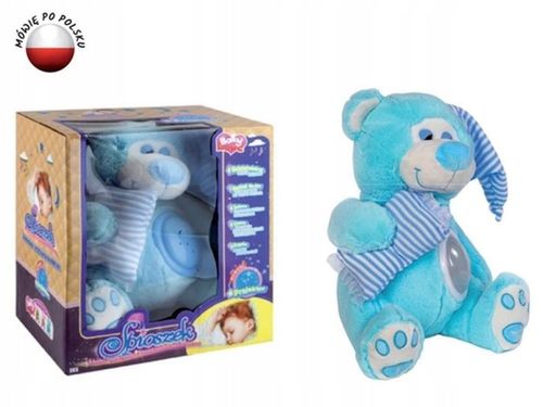Miś wyposażony jest w moduł odtwarzający 4 tradycyjne polskie kołysanki delikatnym, kobiecym głosem. Kojące melodie pomagają zrelaksować się i odpłynąć w krainę słodkich snów. Dodatkowo, wbudowana lampka z projektorem stwarza magiczną atmosferę pobudzającą wyobraźnię.