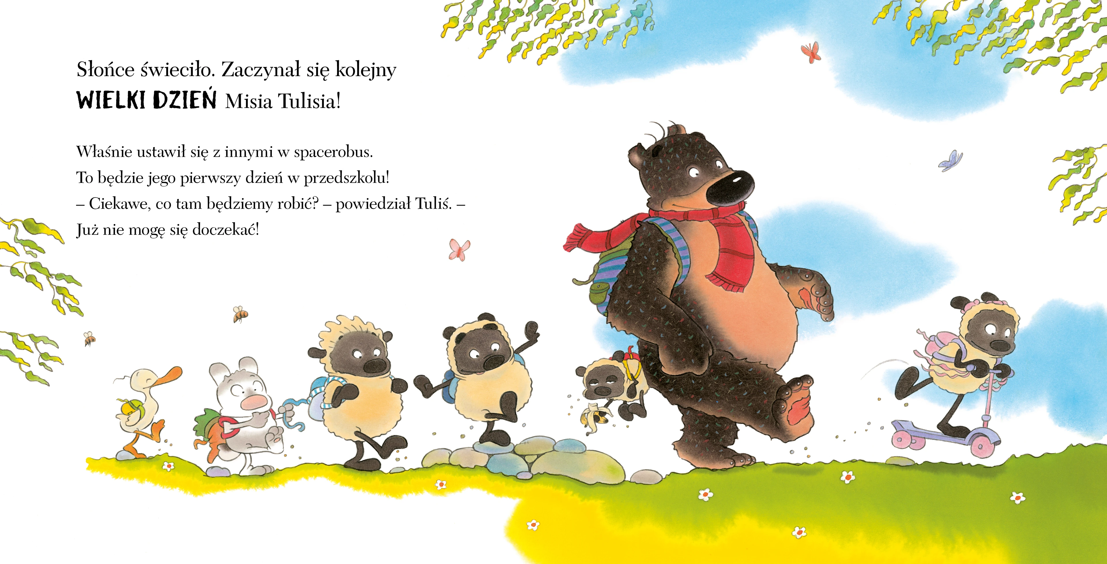 Pierwszy dzień w przedszkolu to nie lada wyzwanie dla każdego dziecka... Dlatego tak bardzo każdemu maluchowi potrzeba wsparcia i "przyjaciela takiego-że-aż". A któż może bardziej roz-bawić, podtrzymać na duchu i przekonać, ile wspaniałych zajęć, zabaw i przygód - i to zupełnie niespodziewanych - czeka w przedszkolu? Miś Tuliś! Wielki miś o wielkim sercu, który ma dla każdego "tyle przyjaźni-że-aż" i "tyle przytuleń-że-aż".